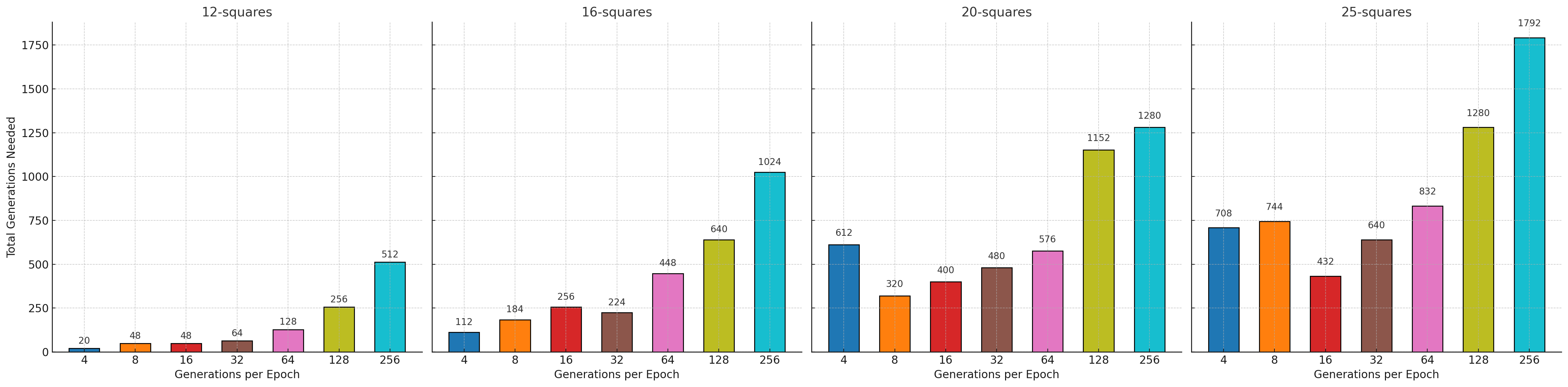 The optimal number of generations per epoch depends on the complexity of the task. It might seem that 16 could be a good choice because works well in all the cases. It requires between 2 and 5 less generation than generating 128 predictions per epoch.