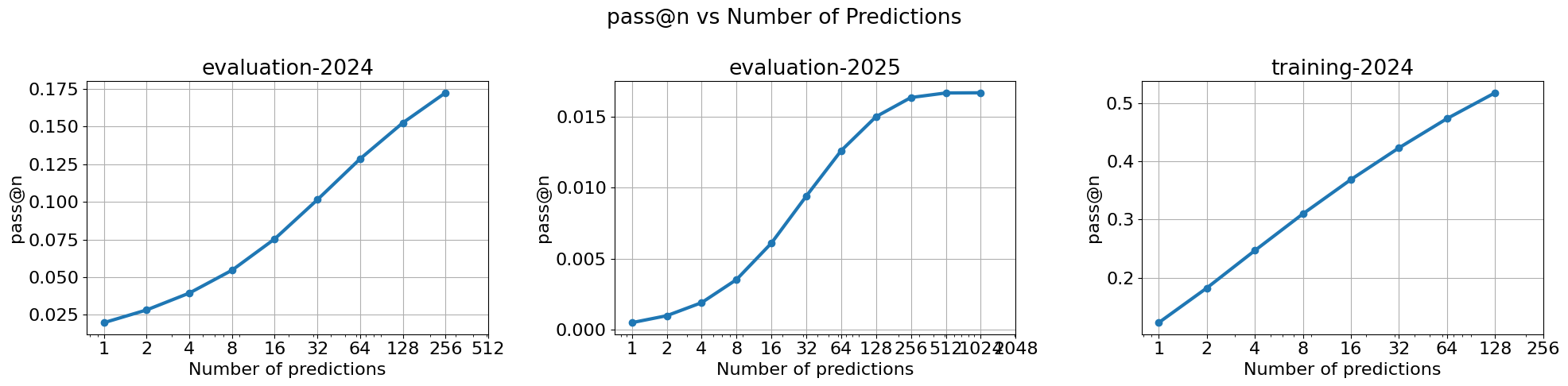 The plot below shows the pass@n for the different datasets versus the number of predictions. I believe this validates my current implementation because I get similar or better numbers to the ones reported in the BARC paper. This could be happening due to using a higher temperature and/or using more input samples.