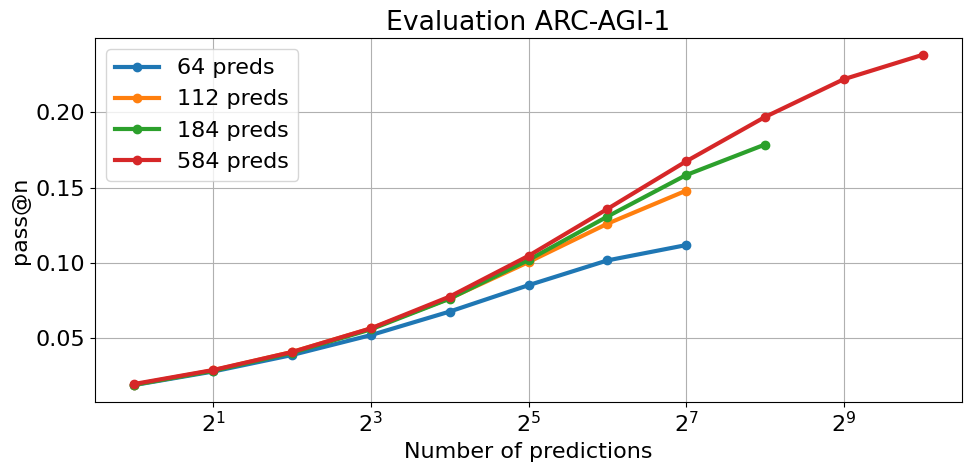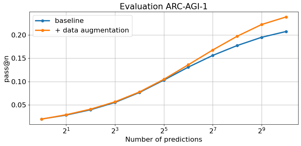 The pass@n metric improves when using data augmentation. The difference is bigger when the number of predictions grows. This could explain why my previous experiments with just 8 predictions per task did not show improvements.