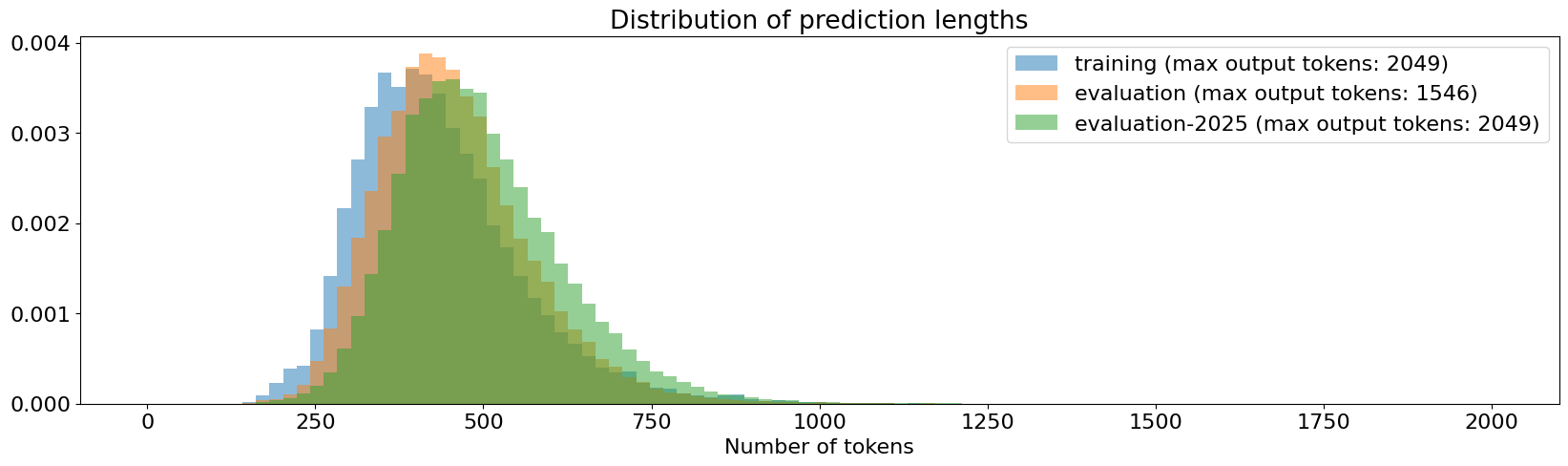 The median output tokens seems to be around 400, and we can see that the datasets are sorted by inference speed as expected. We could probably be using 1024 output tokens without much impact on the results.