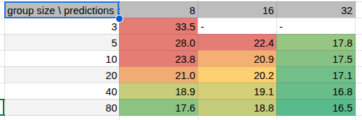 The goal of this experimentation is to find the best compromise between the number of predictions per epoch and the group size. Ideally I will do one prediction per epoch and do not group the tasks, but we have to make a compromise because of the current hardware. Once I find a good configuration we could make experiments with 512 predictions and compare against the previous iteration.