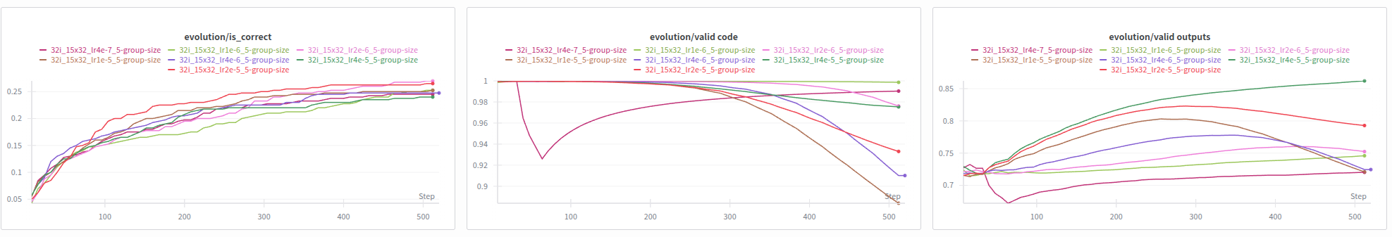 I have tried with different learning rates for the configuration of 32 predictions per group with a group size of 5. The problem of this experiments is that they take more than 3 days to make 512 predictions per task for the 400 validation tasks on a single A6000 GPU. Iteration is very slow.